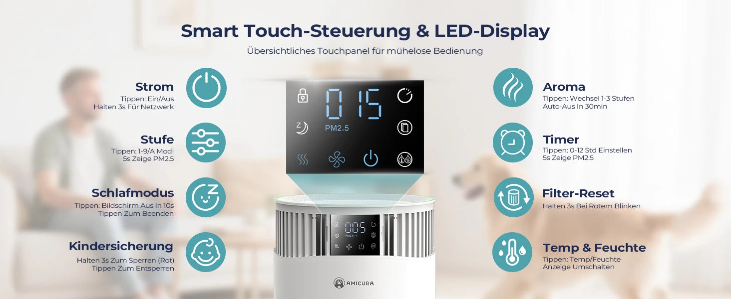 Breathe easier at home with the Amicura P2, a dedicated purifier that tackles pet dander, odors, and hair in real time.