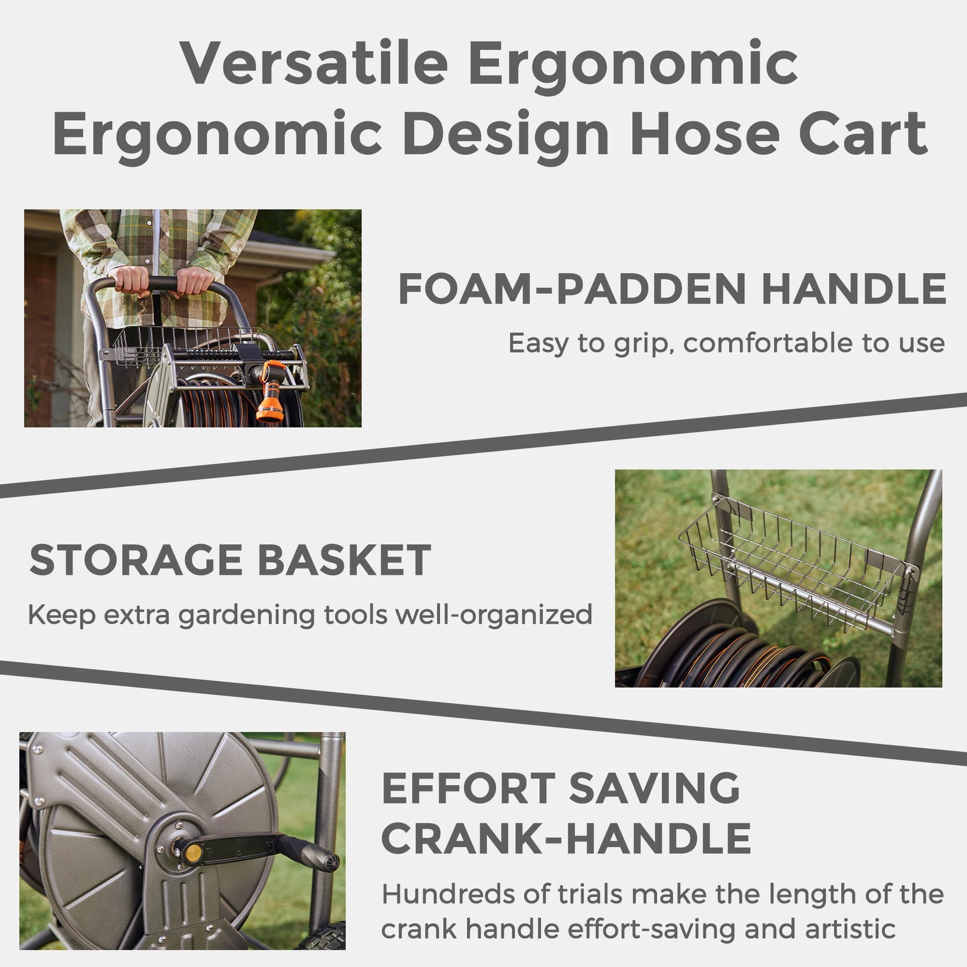 - Simple, nearly tool-free assembly with pre-assembled components and a guided winding system makes setup quick, so you spend less time winding hoses and more watering.