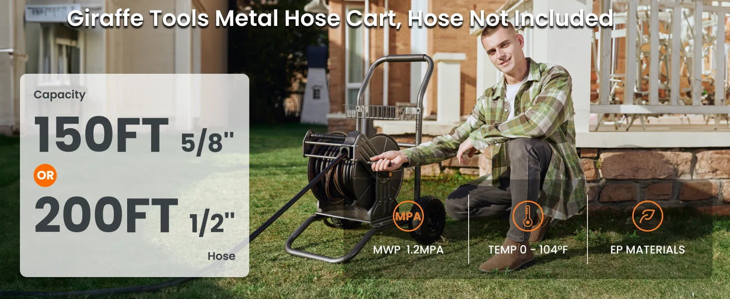 - All-weather, heavy-duty metal frame with a powder-coated finish resists rust and abrasion, while a solid brass connector offers leak-proof, wear-resistant performance for you—the Giraffe Tools Garden Hose Reel Cart with Wheels.
