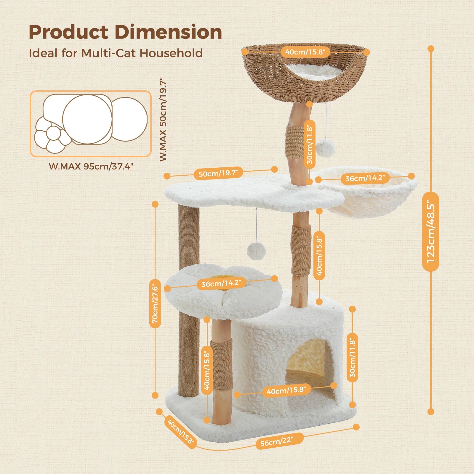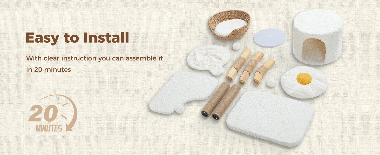 - Offers multiple resting spots—a luxury condo, soft fleece hammock, airy rattan perch, and a flower cat bed—so your feline can climb, scratch, and nap in comfort.
