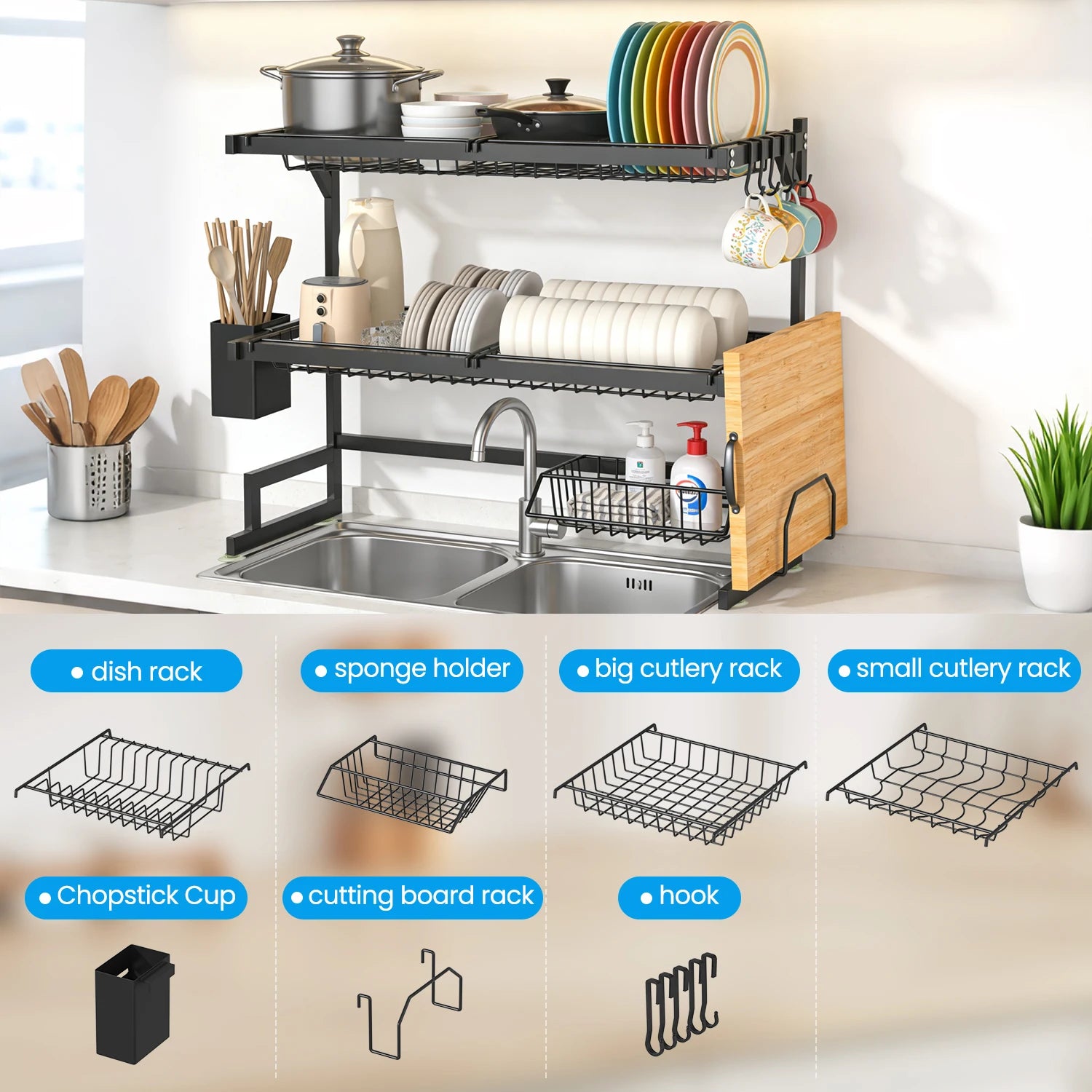Streamline your kitchen cleanup with a sink-mounted, multi-tier dish drainer that handles dishes, utensils, and drying in one compact setup.